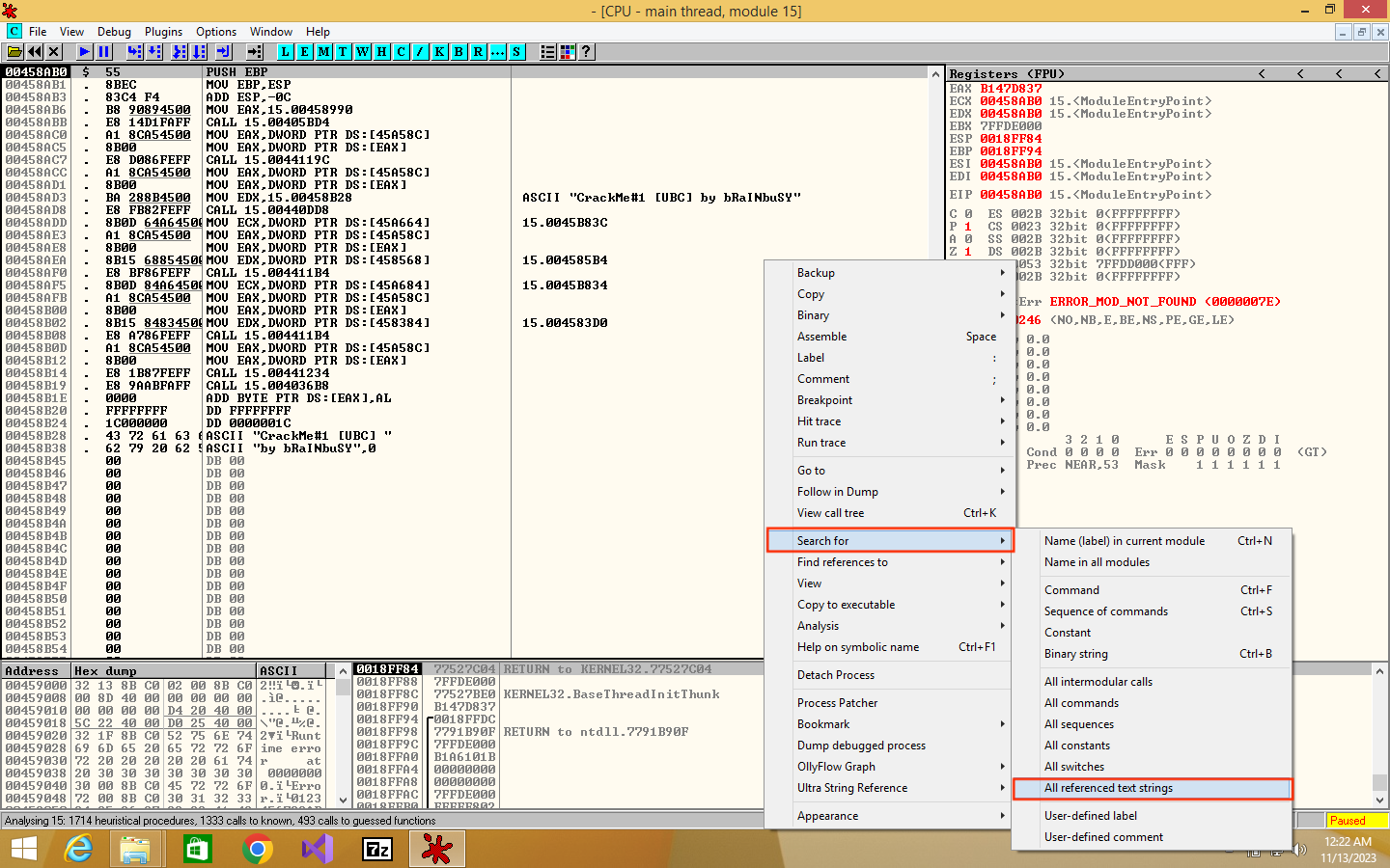 성공/오류메시지의 위치를 찾기 위해 CPU 창에서 우클릭, Search for > All referenced text strings 를 클릭한다.