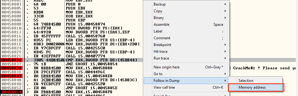 45B844주소에 어떤 데이터가 있는지 확인하기 위해 해당 명령어 줄에서 우클릭한다.