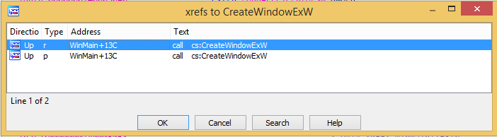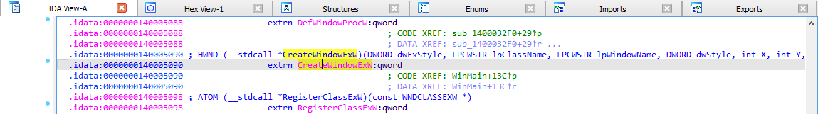 CreateWindowExW를 클릭하고 단축키 x를 눌러 상호참조하는 함수를 찾는다.