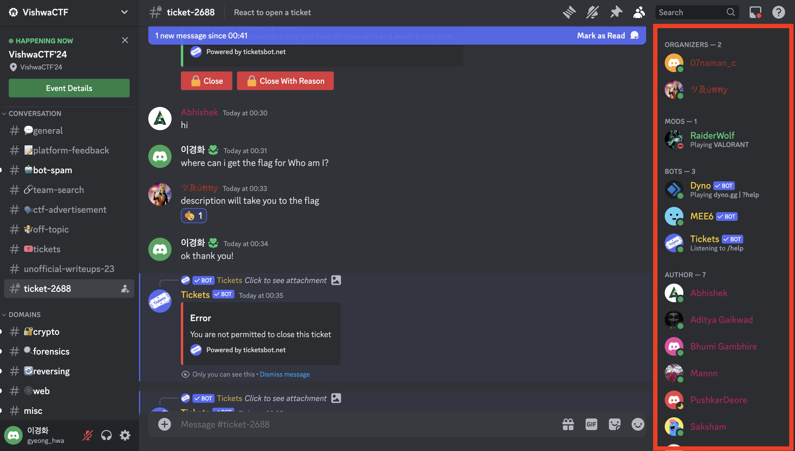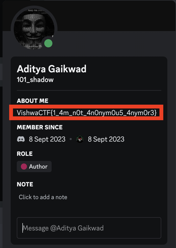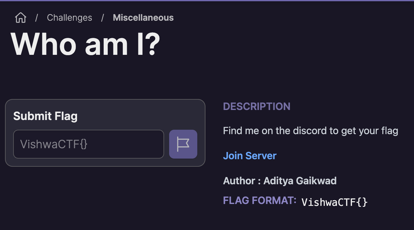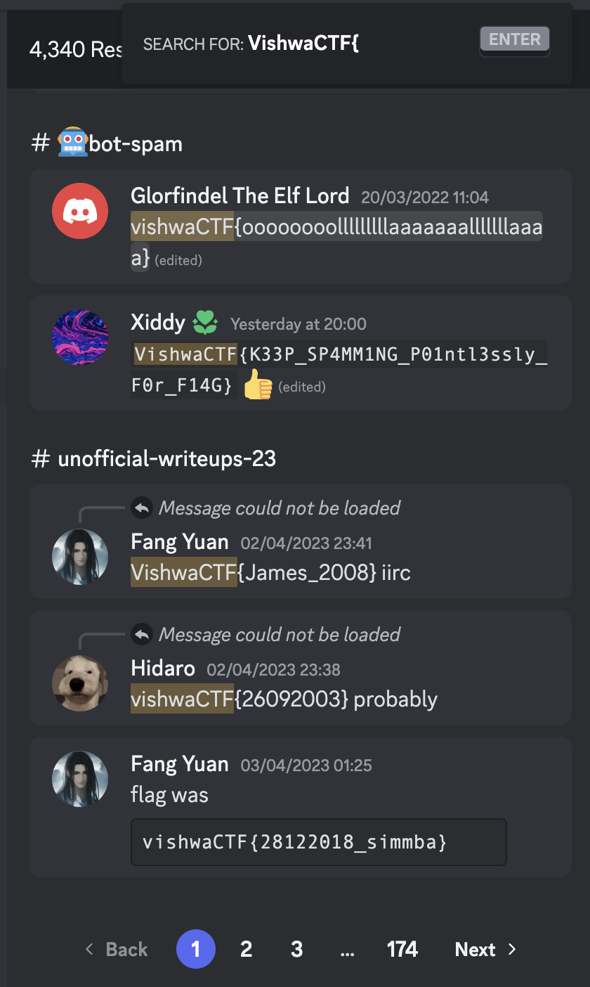 플래그 형식이 VishwaCTF{}라고 되어있기 때문에 디스코드에서 해당 형식을 검색해보았다.