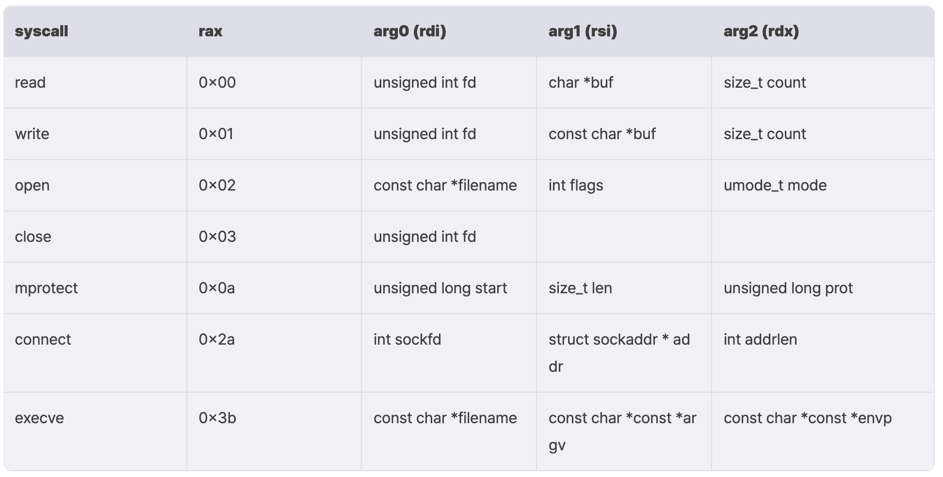 rax, rdi, rsi, rdx에 값을 세팅해놓은 뒤 syscall 명령어를 실행하면 세팅한대로 시스템콜 요청이 이루어진다.