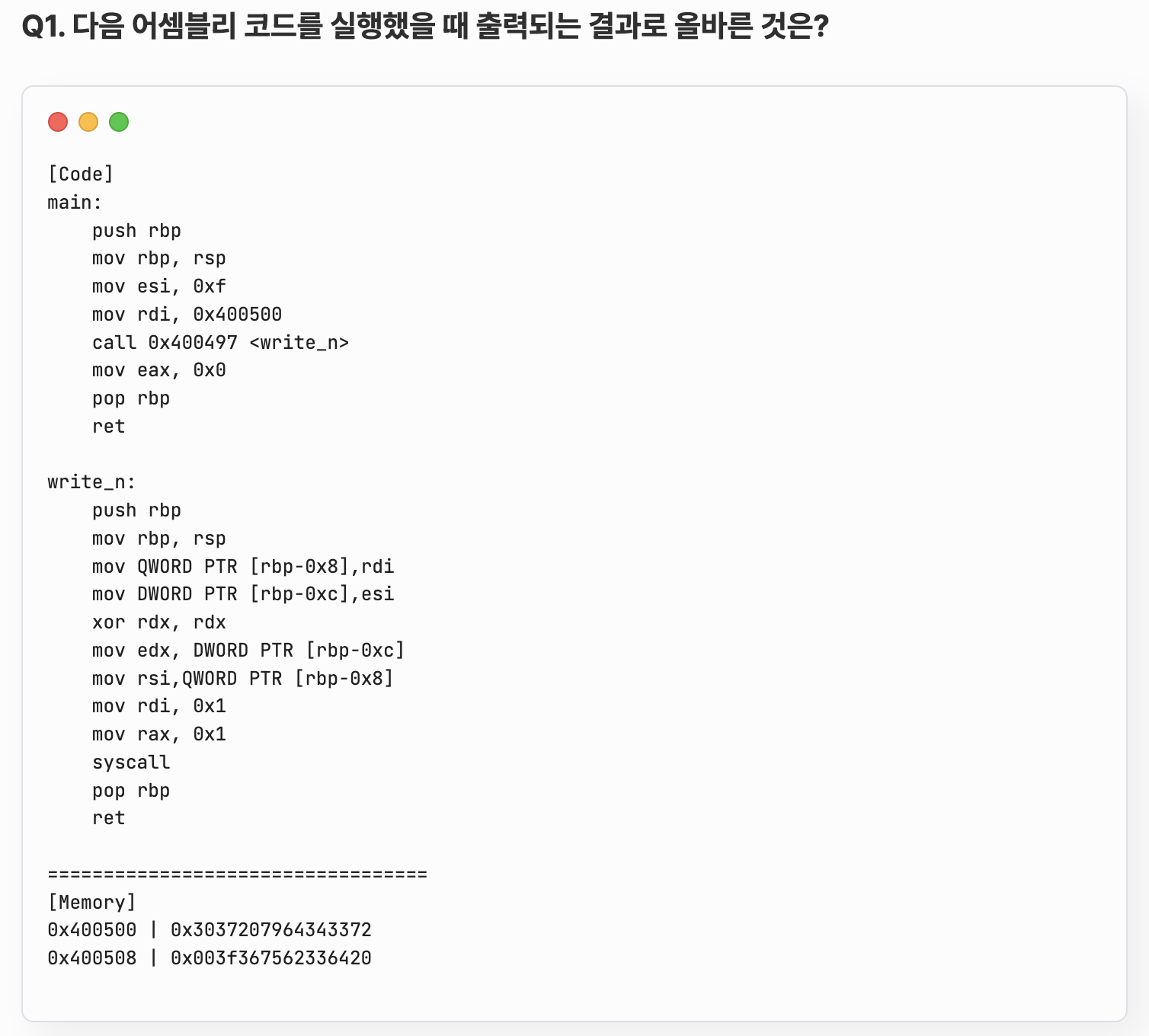 1. write_n함수의 9행에서 mov rax, 0x1을 확인할 수 있다. rax에는 0x1이 세팅되어있고, 이는 write 시스템콜을 요청한다는 의미이다.
