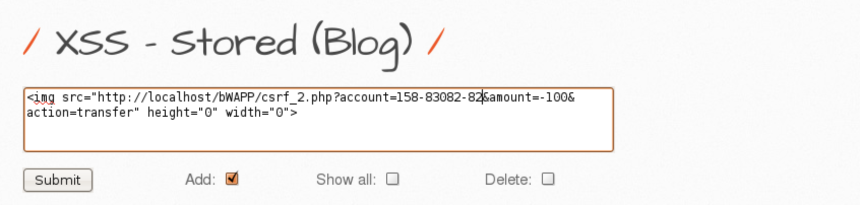 비슷한 방법으로 특정 계좌로 돈을 입금하게 하는 것도 가능하다. xss_stored_1.php 페이지에서 img태그를 이용한 csrf 코드를 입력할 때 amount 값을 양수로 하면, 양식 제출 후 다시 csrf_2.php 페이지로 돌아왔을 때 잔액(Amount on your account)이 감소해있는 것을 확인할 수 있다.