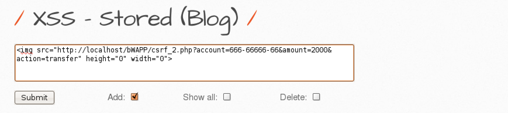 xss_stored_1.php 페이지로 이동하여 img 태그를 이용한 csrf코드를 작성하고 submit 버튼을 클릭하여 정보를 입력한다.