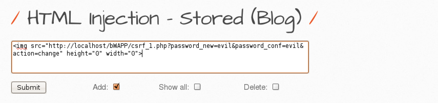 책에 써있는 대로 htmli_stored.php 페이지로 이동해서 img 태그를 이용한 공격 코드를 작성하여 submit 한다.