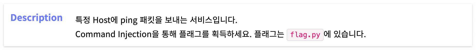 코드를 확인해보면 인덱스 페이지와 ping 페이지 두 개의 페이지가 있는 것을 확인할 수 있다. 두 페이지 중 ping 페이지가 더 중요해보인다. 특히 POST 메소드로 요청을 받았을 때 host 값을 받고 해당 host로 ping을 보내는 명령어를 셸에서 실행한다. 이 부분에서 공격자는 command injection 공격을 시도할 수 있다.