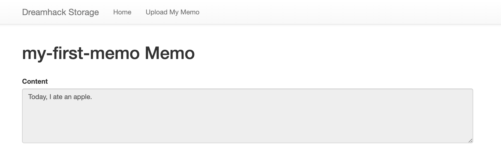 Upload My Memo 페이지로 들어가면 파일을 업로드할 수 있는 기능이 있는 것을 확인할 수 있다. 테스트 삼아 Filename과 Content에 아무 내용이나 적어 Upload해본다.