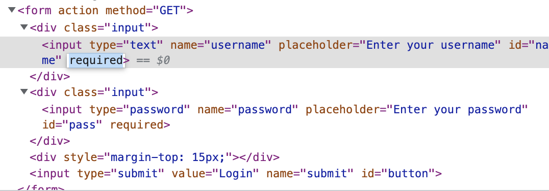 개발자 도구를 열어서 해당 element를 찾아낸 다음 required 속성을 지워봤다. 그리고 다시 폼을 전송해보았다.