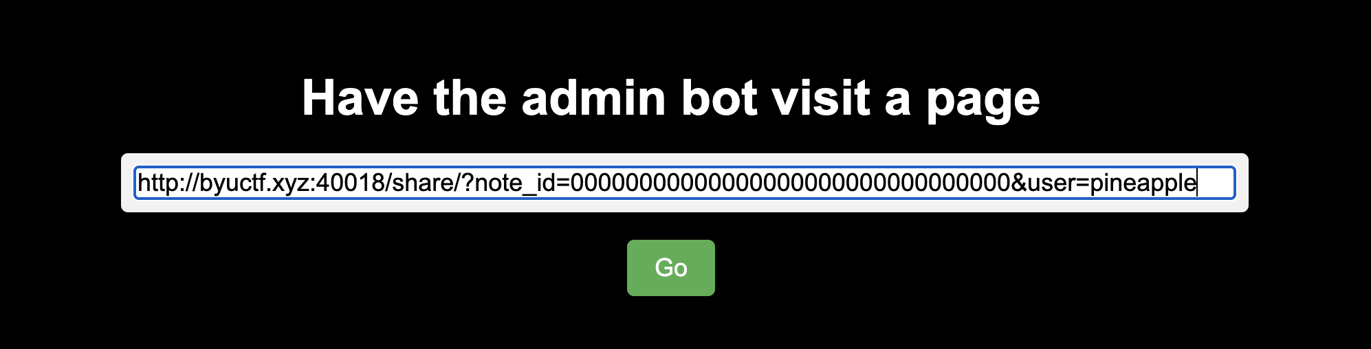 admin bot을 통해 /share 엔드포인트에 방문하는데, 그때 note_id를 FLAG 값을 가진 note의 id 인 00000000000000000000000000000000으로 하고, user를 note를 공유할 user, pineapple로 하면 admin의 노트를 pineapple이 공유받을 수 있을 것 같다는 예측을 해본다.