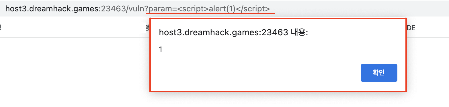 코드를 확인해보면, vuln 페이지에서는 사용자가 입력한 url에 있는 파라미터 값을 그대로 return 하는 것을 볼 수 있다. vuln 페이지로 들어갔을 때 alert창이 뜨는 것은 param 파라미터 값으로 입력된 스크립트 코드가 그대로 실행된 것임을 알 수 있다. 이 부분에서 vuln페이지가 xss에 취약한 페이지임을 알 수 있다.