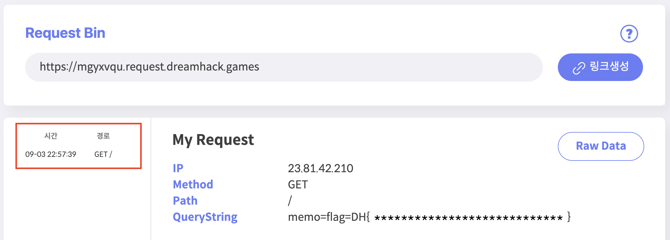 Dreamhack Tools > Request Bin 으로 들어가면 랜덤 url을 생성해준다. 해당 url에 3번 단계에서 memo 파라미터에 document.cookie를 줬던 것처럼 스크립트 코드를 붙인다.