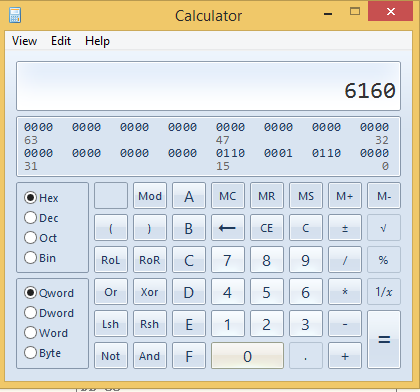 계산기 프로그램을 열어 Hex 값 6160을 입력한다.