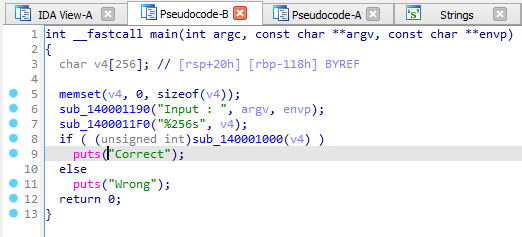 if문에서 sub_140001000() 함수의 결과값에 따라 Correct 또는 Wrong을 출력한다.
