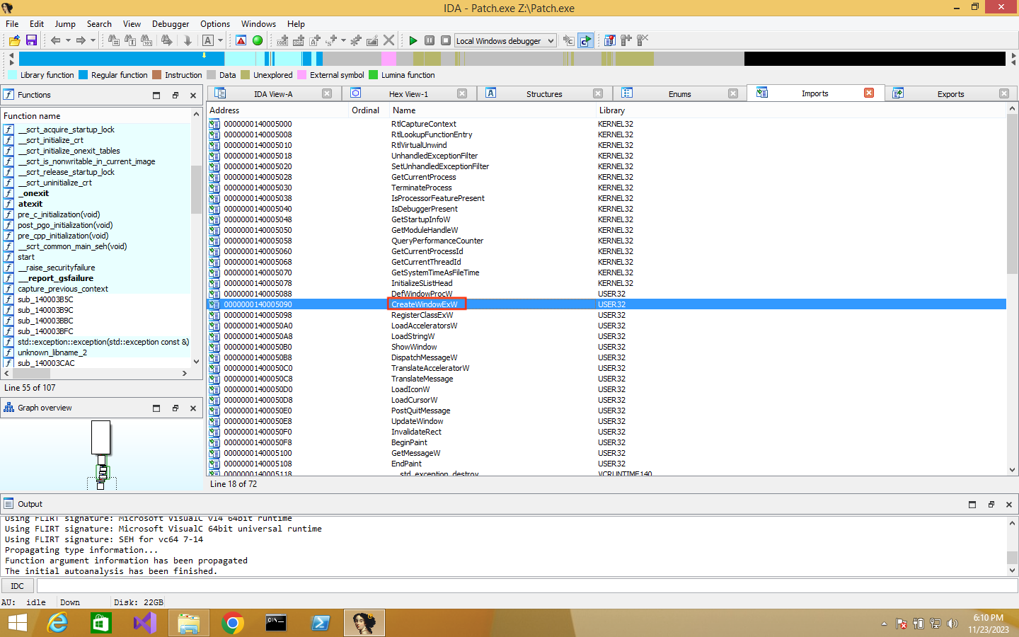 CreateWindowExW를 클릭하고 단축키 x를 눌러 상호참조하는 함수를 찾는다.
